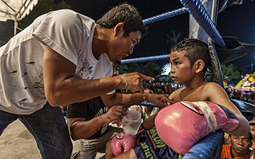 The coach gives orders to his boxer who is only 9 years old. Thailand.