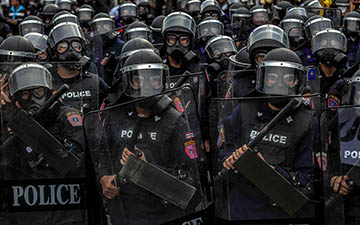 The riot police is ready to act in a demonstration in downtown Bangkok.
