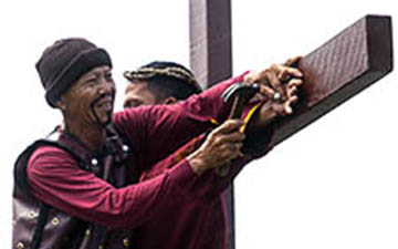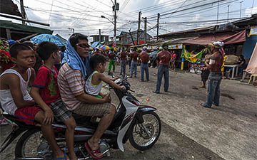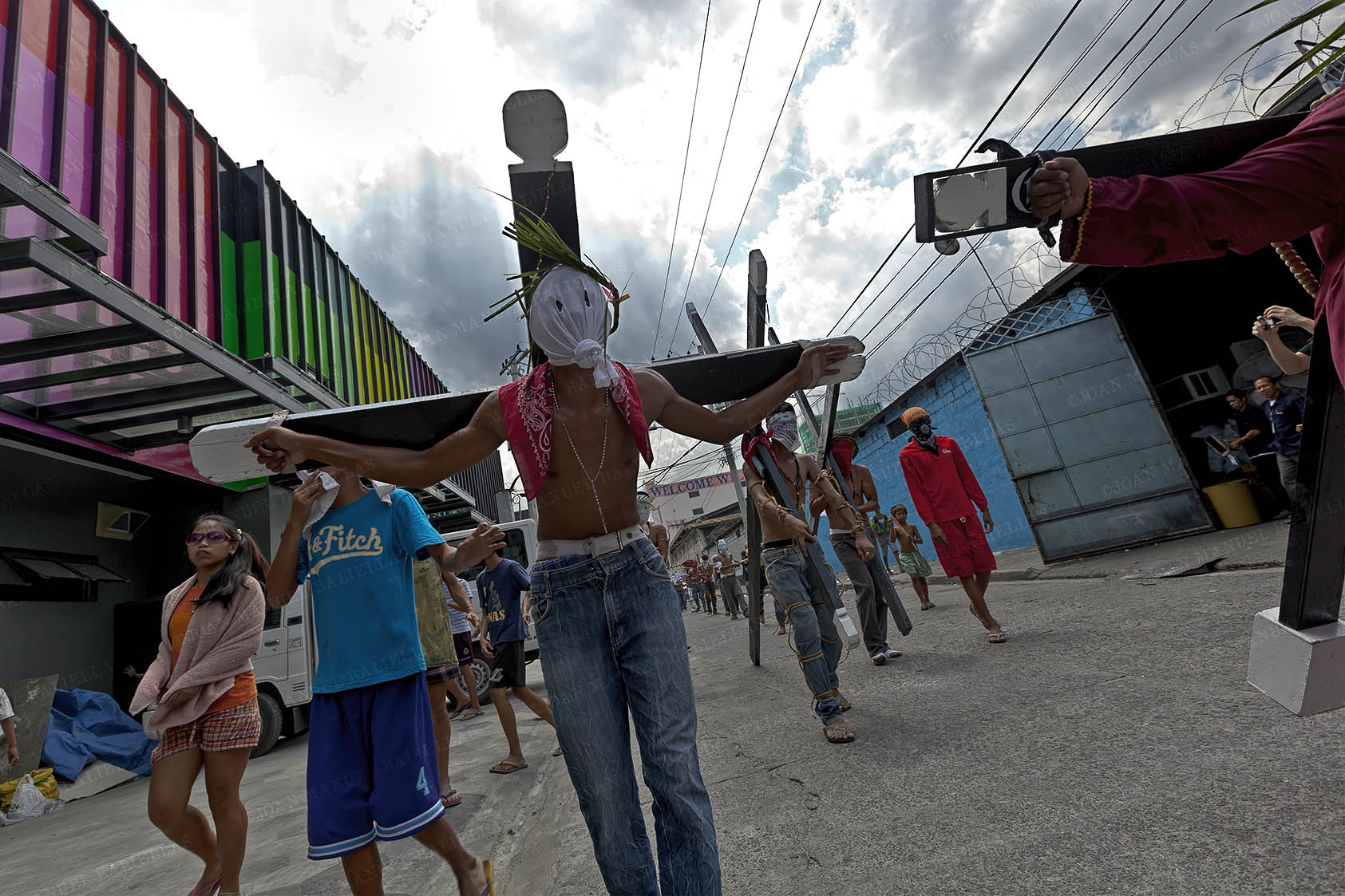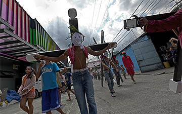 Surrounded by what looks like a carnival, the cross bearers arrive.
