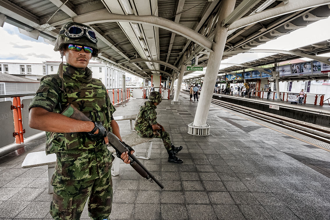 Military take control at the Skytrain stations in Bangkok, during riots.