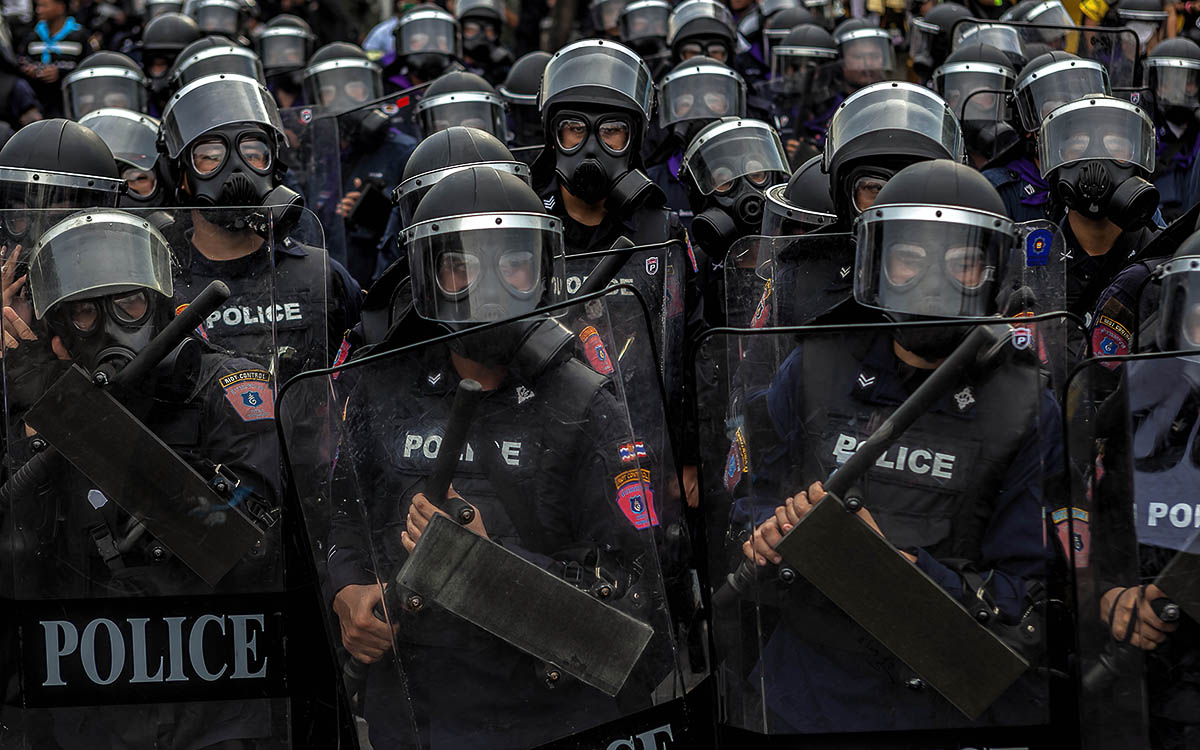 The riot police is ready to act in a demonstration in downtown Bangkok.