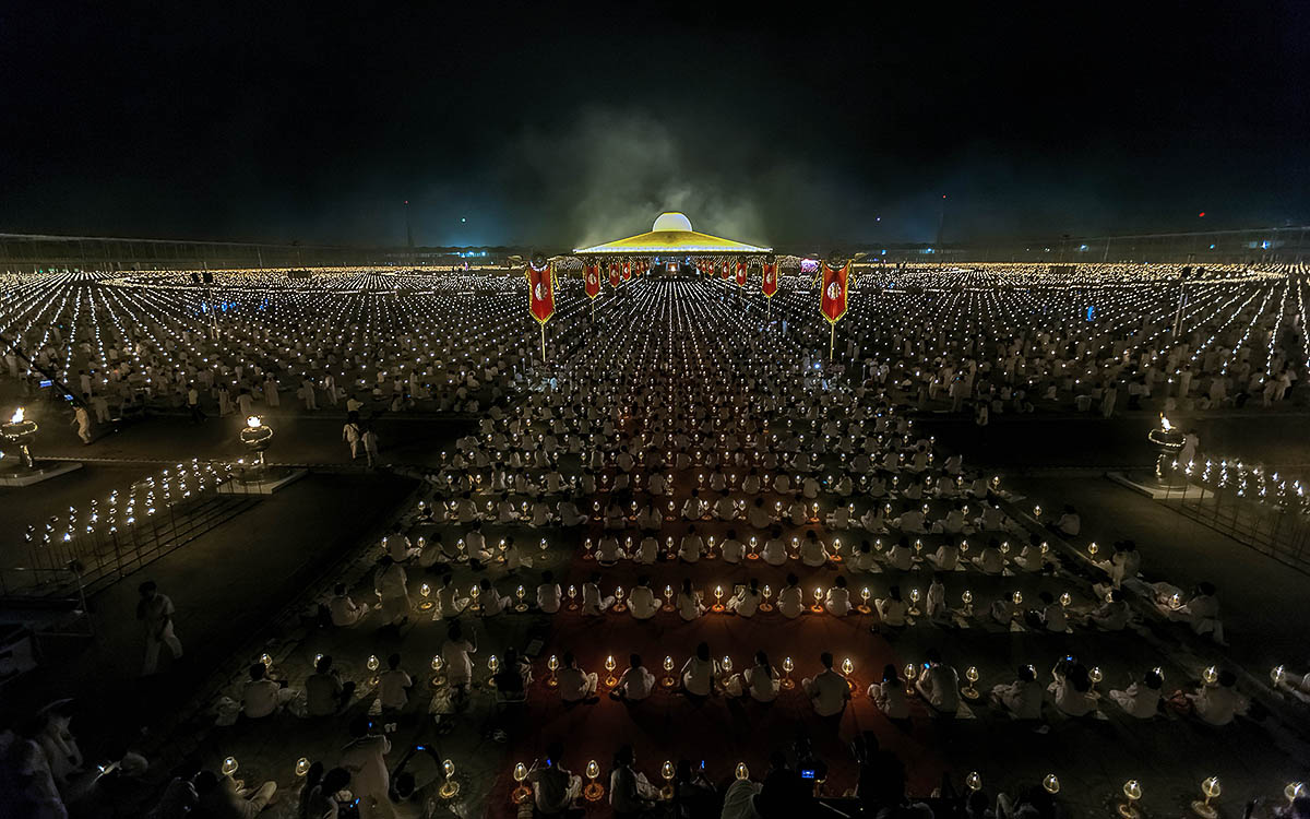 Hundreds of Buddhists from the Dhammakaya movement that was founded in Thailand prays during Makha Bucha day at Wat Phra Dhammakaya in Pathum Thani province, north of Bangkok, Thailand.