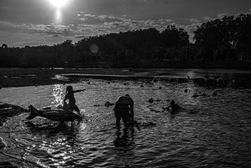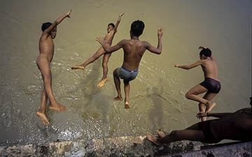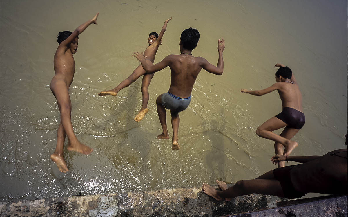 Children play and jump in the waters of the polluted Ganges River in the city of Varanasi, India..