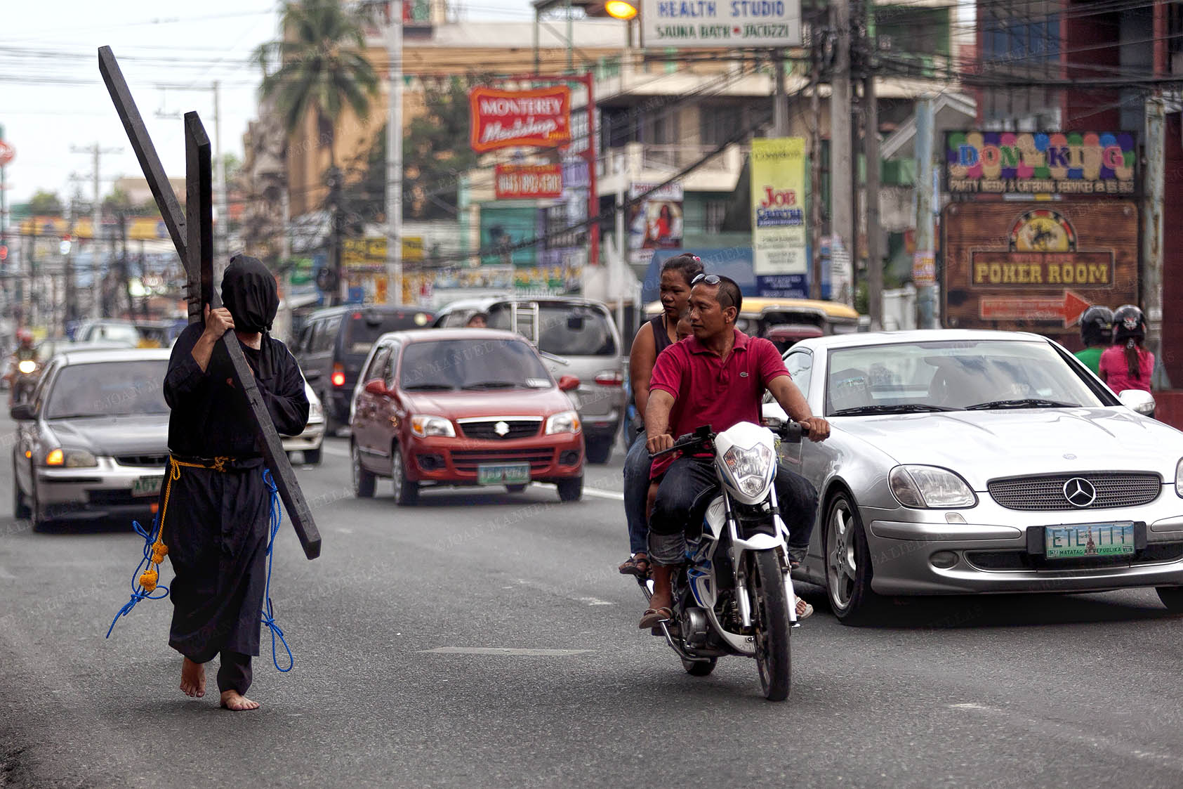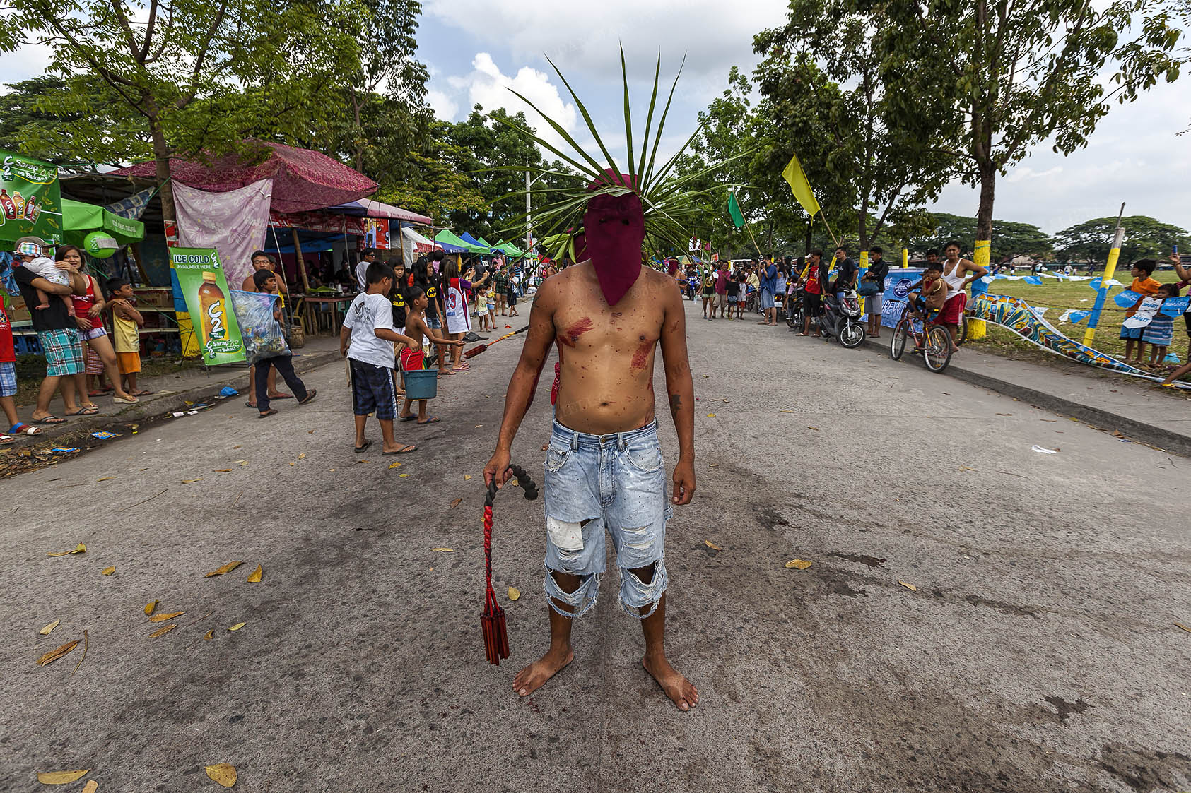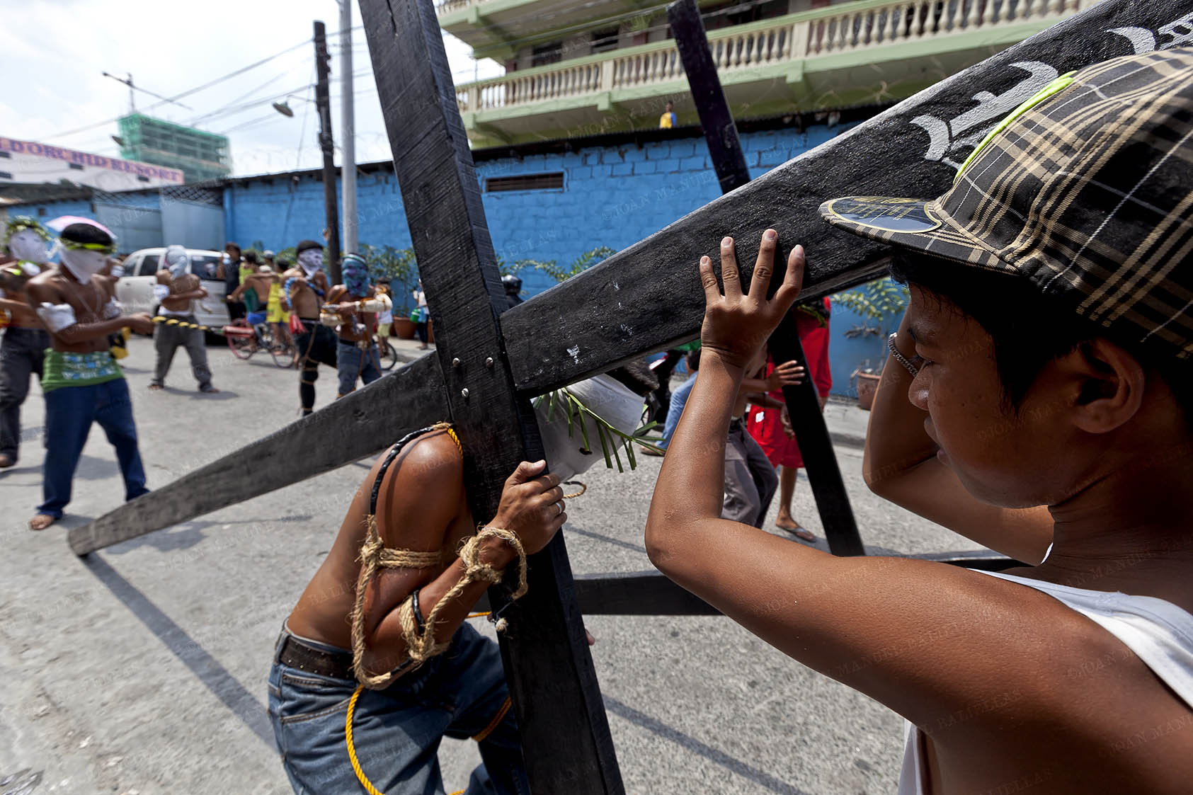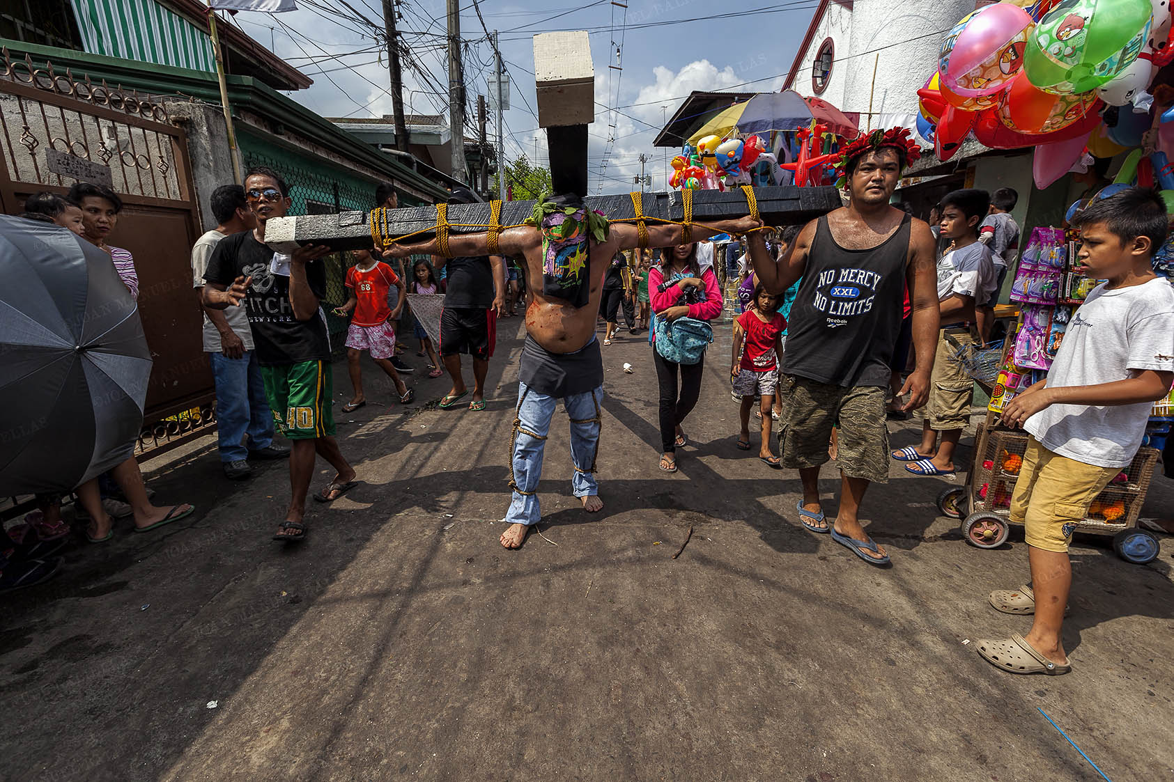 Surrounded by what looks like a carnival, the cross bearers arrive.