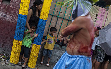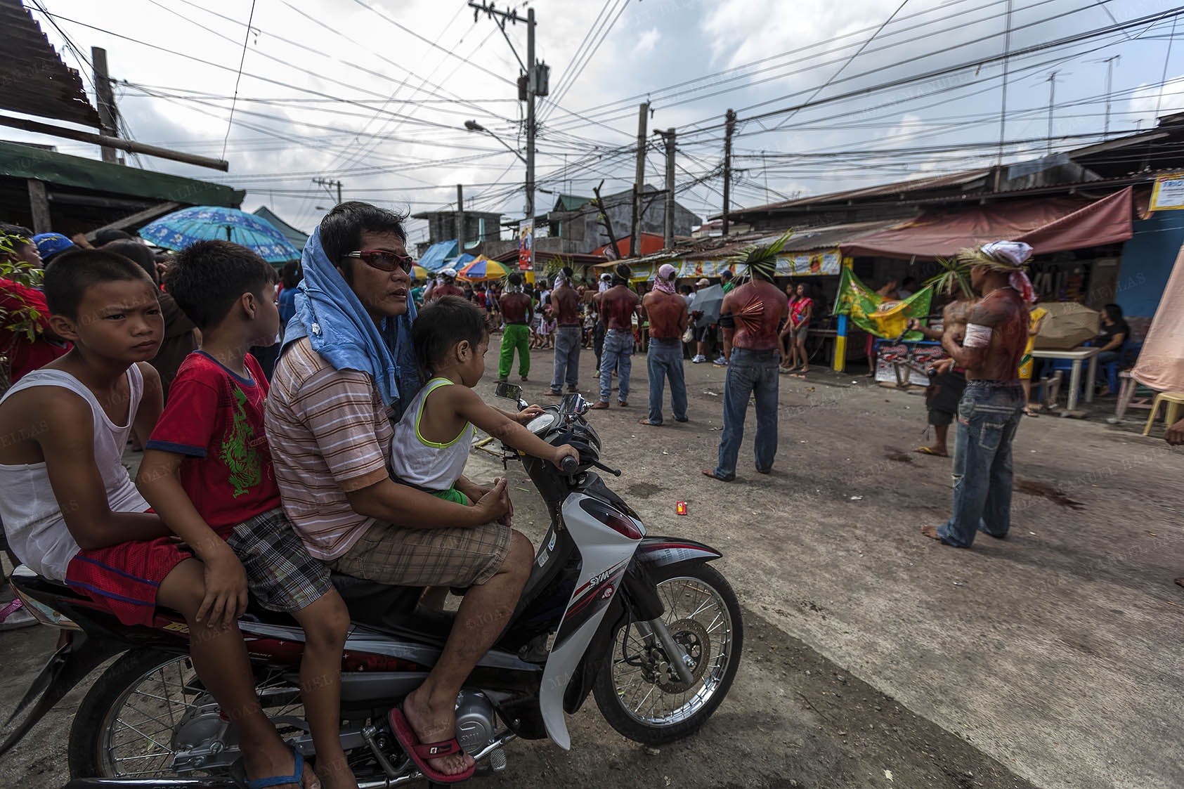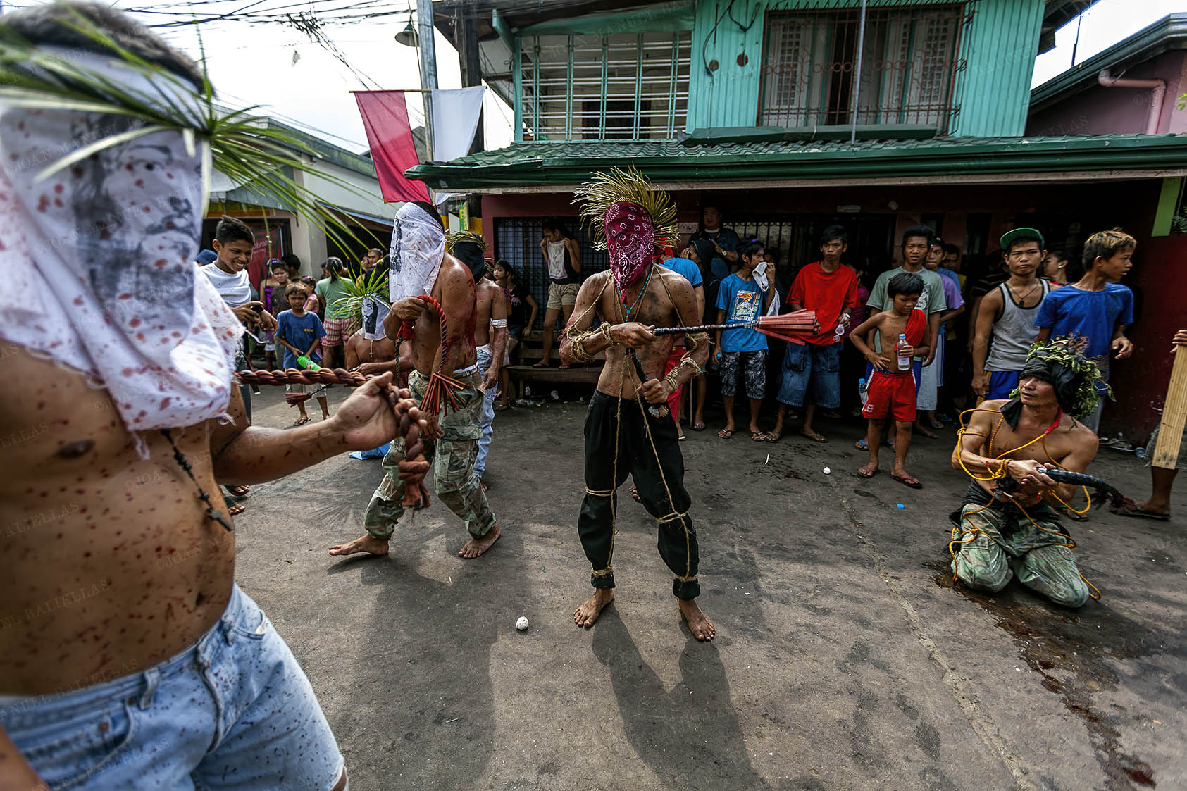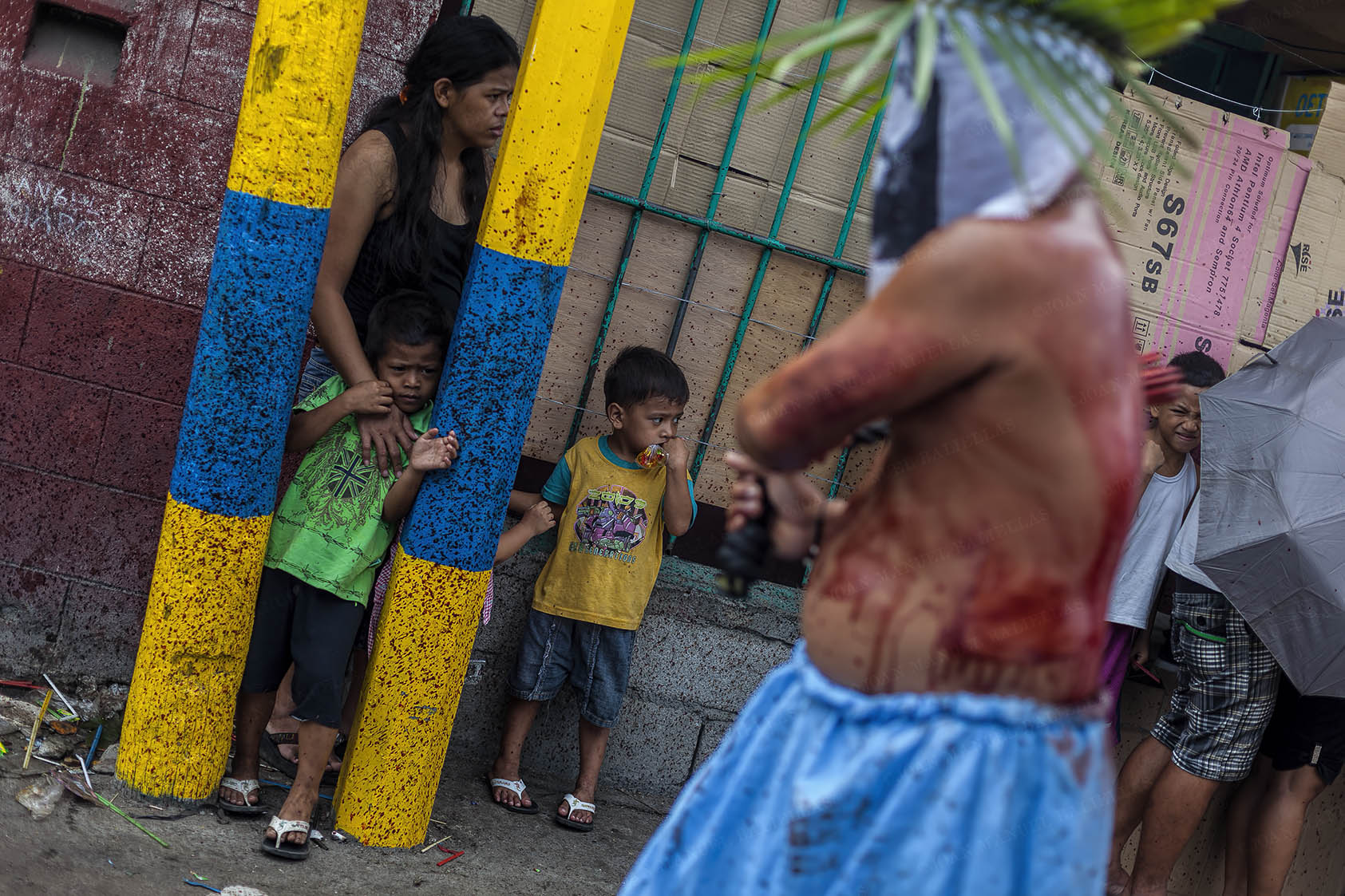 People protect themselves from the blood that the penitents sprinkle during their procession, the streets are the same as if they had been painted to the blood "Gotelé" or Stippling.