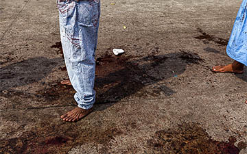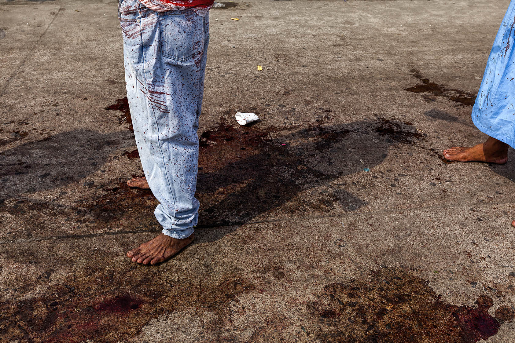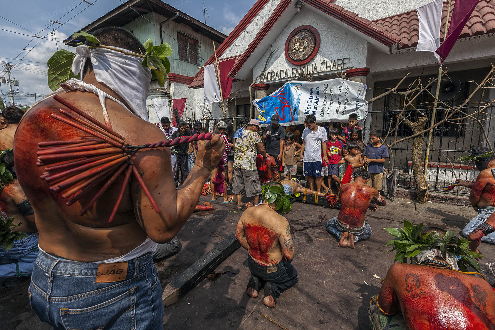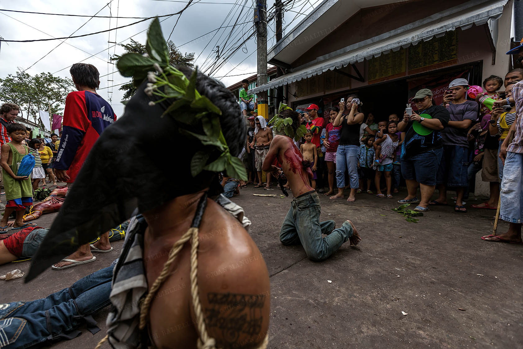 People protect themselves from the blood that the penitents sprinkle during their procession, the streets are the same as if they had been painted to the blood "Gotelé" or Stippling.