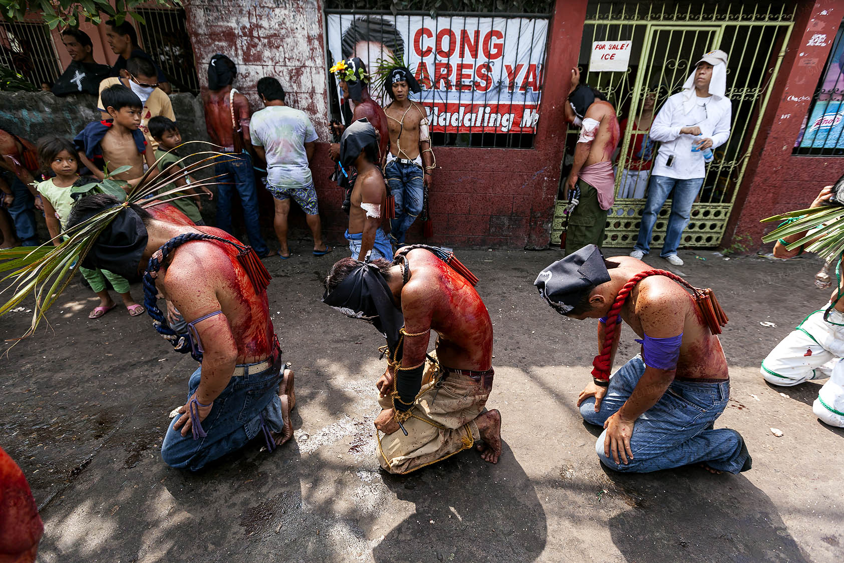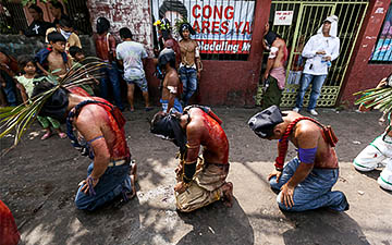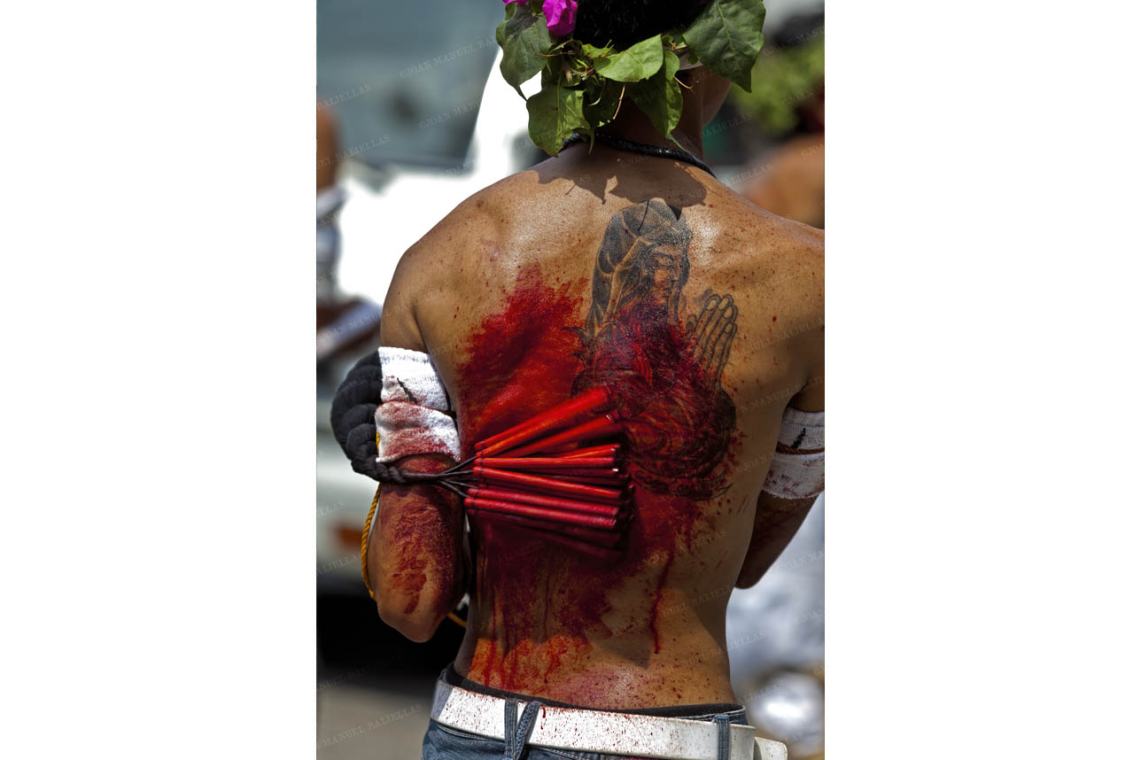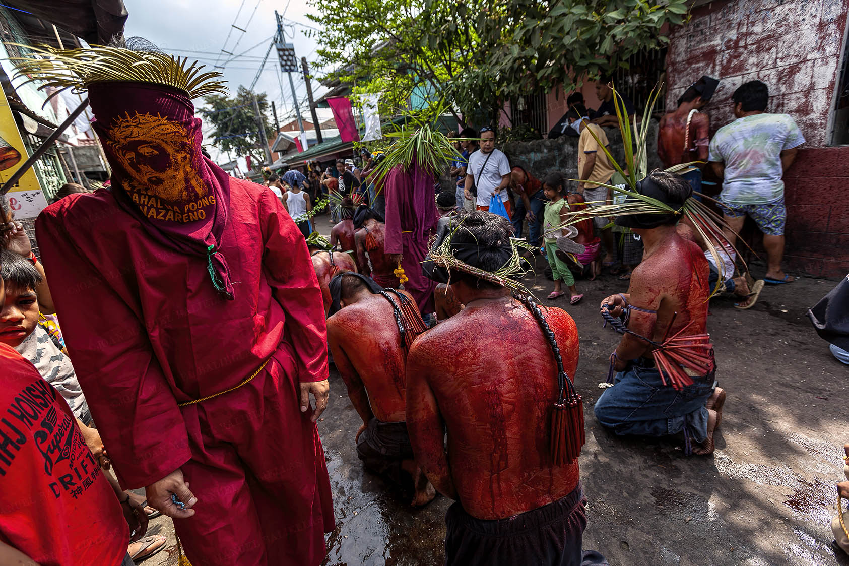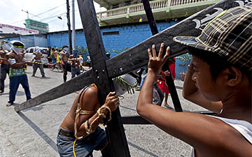 The penitents carry their heavy crosses throughout the procession.